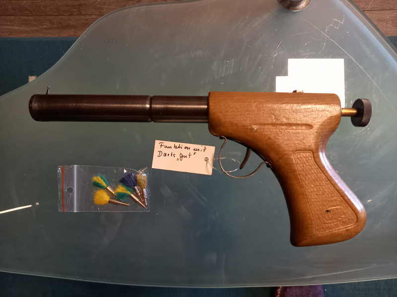 Sie bieten hier auf eine sehr selten gewordene Rarität es ist eine Koma LDP 3, später unter der Waffenschmiede Voere bekannt. Sie wurde in den 50er bis 60er Jahren vertrieben. Man muss die Rändelschraube vorne am Lauf aufdrehen und damit den Innenlauf entfernen. Man führt eine 4,5mm Diabolo- oder einen Federbolzen ein und schraubt wieder zu. Ander Rückseite ist der Spannknopf angebracht. Diesen zieht man kraftvoll nach hinten aus bis er einrastet. Dann ist sie schussbereit. Die Pistole macht einen wenig benutzen Eindruck. Sie ist im Bestzustand. Kein Flugrost, auch der Griff ist bestens erhalten. Ich habe sie mit Federbolzen probiert, das funktioniert wunderbar. Eigentlich zu schade zum schießen. Ein schönes Sammlerstück. Verkauf nur an Personen über 18 Jahren, Altersnachweis erforderlich. Privatverkauf keine Garantie oder Gewährleistung, kein Umtausch oder Rücknahme. Verkauf nur innerhalb der EU. Versandkosten nur für Deutschland, für EU Versand bitte vorher Kosten anfragen. Viel Spaß beim bieten!