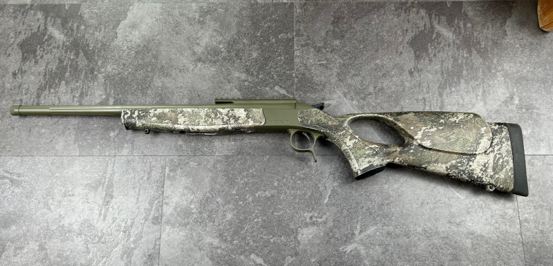 Bergara Kipplaufbüchse im Kal. 223 Remington, Mod. Strata BA TD, Alle Metallteile sind grün beschichtet, der Schaft ist im Camoflage look,