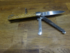 ca. 100 Jahre altes Jagdmesser mit Klinge, Säge, Haken und Korkenzieher, in sehr gutem Zustand, mit Hirschhorngriffschalen, alle Klingen mit dem Zwillingsymbol und der Bezeichnung rostfrei sowie D.R.G.M., etwas sehr seltenes heute in diesem Zustand für Sammler dieses genres, das Messer steckt in einer passenden Nappa-Leder-Hülle schwarz von Puma original.