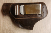 Holster in Leder für Revolver, auf einer Seite mit Gürtel-Clip, auf der anderen Seite mit Schlitzen, so dass man den Gürtel durchziehen kann. Ohne abgebildete Waffe.