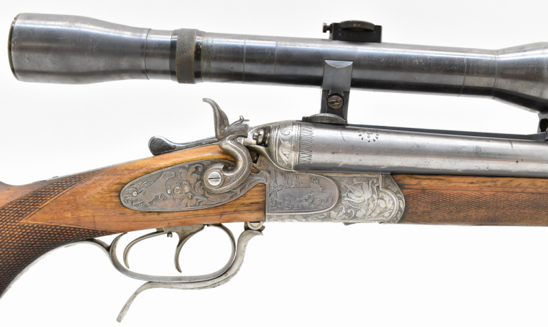 Hahn Drilling mit Schaftmagazin für 4 Patronen. Ansprechende Gravur mit Tier-und Blattmotiven. Die Läufe sind alle sehr rostnarbig und matt. Montiert ist ein ZF Gerard punziert mit "K" mittels einer Einhakmontage. Schaftlänge 35cm gemessen vom vorderen Abzug bis Mitte Schaftkappe.