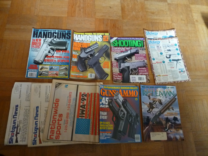 Verkaufe aus Nachlaß einen Konvolut US-Waffenmagazine bzw. Kataloghefte: Shotgun News Hefte 9 und 10 aus 1993, Nationwide Sports Heft Nr. 41 aus 4/1991, Guns & Ammo Heft 3/1993, American Rifleman Heft 9/1993, Midway Kataloghefte 8 und 9 aus 1993, The Complete Book of Handguns by Massad Ayoob aus 1993, Shooting Times Heft 3/1993, Handguns Heft 2/1993. Ich bewerte die Hefte mit Zustand befriedigend, weil diese ca. 30 Jahre und länger im Keller aufbewahrt waren und dadurch zum Teil minimal, aber erträglich, stockfleckig und mit leichtem Kellergeruch sind. Anstreichungen können vorhanden sein. Es sind keine zerfledderten Hefte dabei. Privatverkauf, daher keine Gewähr, keine Garantie und keine Rücknahme.