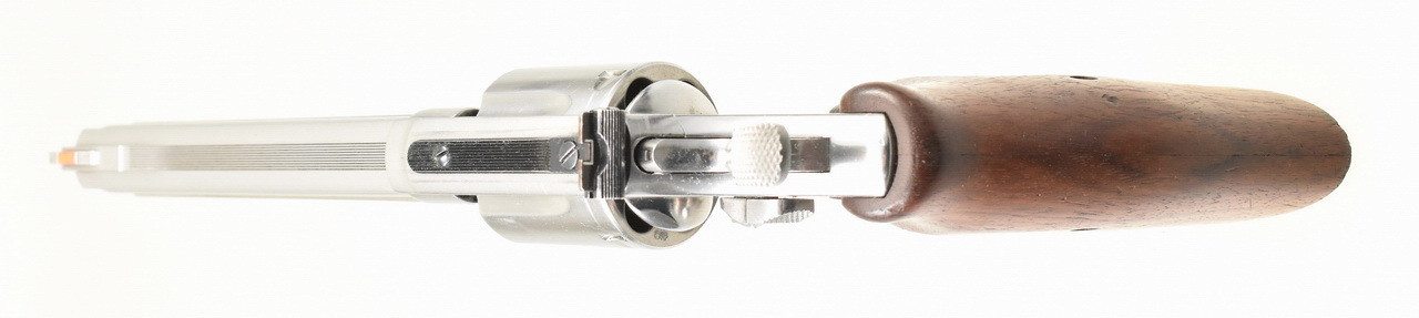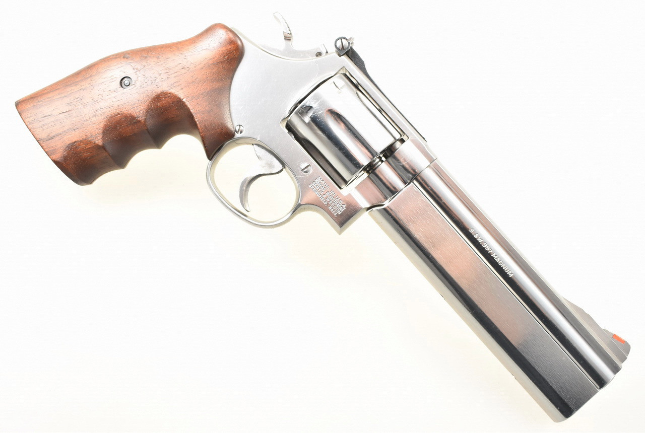 Gebrauchter Stainless - Steel Double Action Revolver Modell 686 - 4 des bekannten amerikanischen Herstellers Smith & Wesson. Spiegelblanker Lauf. Belgischer Beschuß. AKAH Vertriebsstempel. Laufgewicht 260g. Höhen- und seitenverstellbare Visierung mit White Outline Kimmenblatt. Rampenkorn mit roter Kunststoffeinlage. 190mm lange Visierlinie. NILL Holzgriffschalen für Rechtsschützen mit angedeuteter Daumenauflage und Fingerrillen. Details siehe Bilder.
