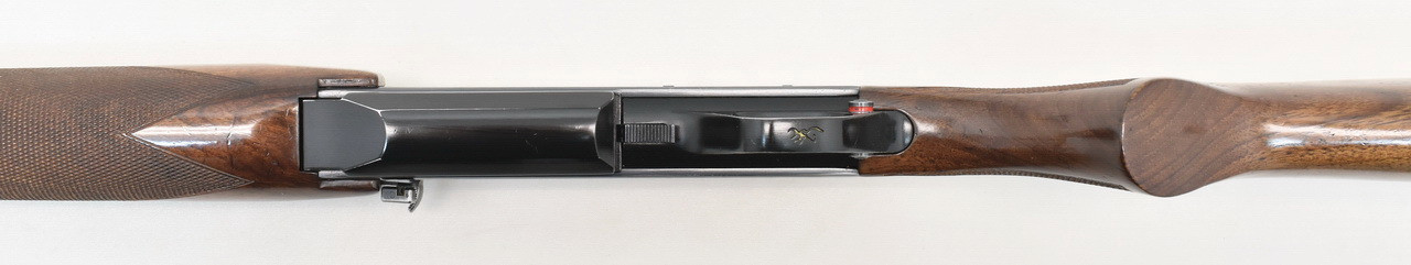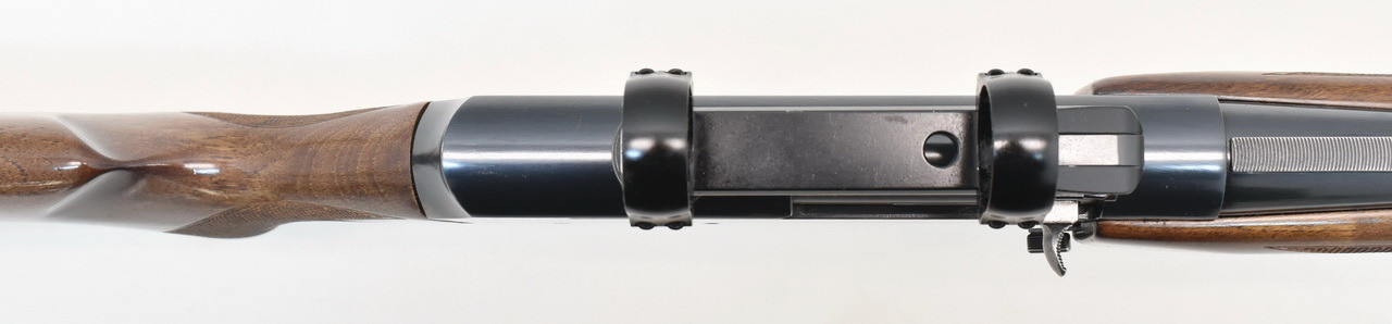 Führiger Gasdrucklader mit stabilem Drehwarzenverschluß und Stahlsystem der belgischen FN / Fabrique Nationale, Herstal Modell BAR Mark II " Battue ". Spiegelblanker Lauf mit Drückjagdschiene und Leuchtkorn. Belgischer Beschuß. 333mm langer Pistolengriff - Schaft für Rechts- und Linksschützen ( Schaftlänge gemessen vom Abzug bis Mitte Gummischaftkappe ). Brücken - Schwenkmontage mit Drehverschluß für Zielfernrohr mit 30mm Mittelrohr. Mit Trage-, Gebrauchs- und Lagerungsspuren einer geführten Jagdwaffe. Details siehe Bilder.
