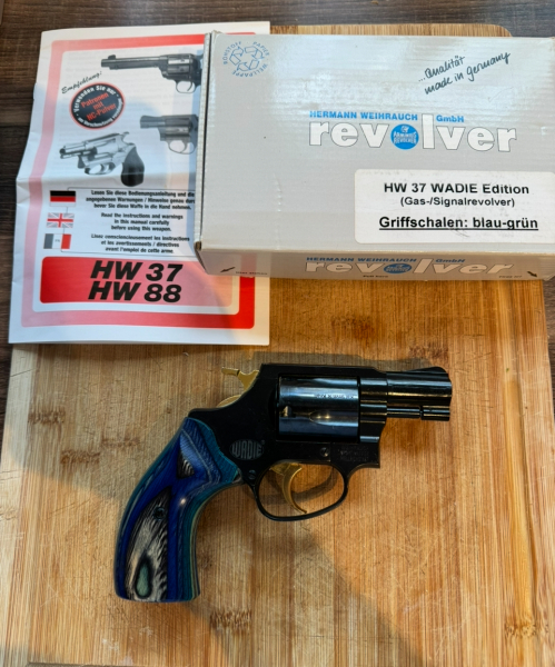 Ich verkaufe hier einen Revolver der Sonderedition Wadie mit vergoldeten Elementen von der Firma Weihrauch Typ Arminius, HW 37. Diese Sonderedition gibt es mittlerweile nicht mehr neu zu kaufen. Mein Exemplar wurde nur gelegentlich geschossen (wenn es 15 Schuss waren, ist es viel). Wie auf den Bildern zu sehen ist, gehören auch noch das Original Zubehör, die Schachtel und die Bedienungsanleitung dazu.