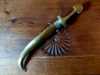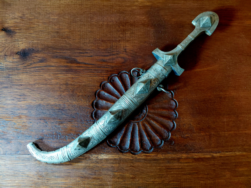 Messing. Das Teil stammt aus einem Nachlass in welchem sich nur höherwertige Blankwaffen befanden. Die Handarbeiten sind toll ausgeführt. Die Gesamtlänge, eingesteckt in Scheide, ist 40 cm. Über die Abstammungsregion kann ich nur rätseln. Meiner Meinung nach
