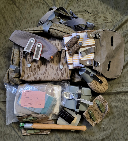 Dieses Konvolut besteht aus Ausrüstungsteilen der ehem. NVA . Eine Tasche sog. Teil 2 . Darauf ist eine ein Strich kein Strich Plane gebunden . Hinten ist das dazu gehörige Koppeltragegestell eingehakt . Ein Käppi Gr.58 . Schulterstücke Unterfeldwebel , Felddienstschulterstücke Major , NVA Handtücher , Eierhandgranatentasche , Brotbeutel , Feldflasche , Kochgeschirr m. Besteck ,dieses mit NVA gestempelt . Ein Reinigungsgerät RG57 für AK47 . Eine Packung Eiserne Ration , ein Feldspaten m. Tragetasche und eine Ernstfall / Einsatzgarnitur . Diese Packung ist noch in der original verschweißten Folie . Noch nie geöffnet . Der Inhalt der Einsatzgarnitur siehe Foto Beipackzettel . Auf Grund der Menge und Grösse des Pakets Porto D siehe oben . EU Versand 25,00 Euro . Ich versende versichert mit Sendungsverfolgung . Privatverkauf .