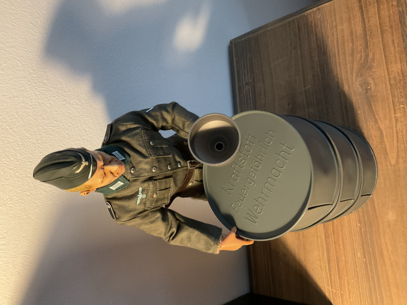 Landser , Soldat Wehrmacht Custom Figur im Maßstab 1/6 mit Treibstofffass aus Metall , ebenfalls in 1/6 .