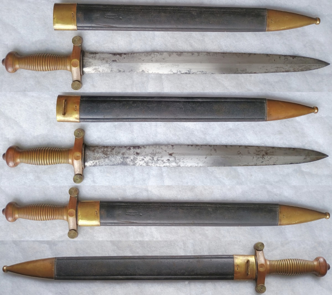 Faschinenmesser M 1831 hergestellt von Talabot, Paris mit Lederscheide. Diverse Abnahmepunzen. Klinge mit einigen Rostflecken, Scheide in gutem Zustand.
