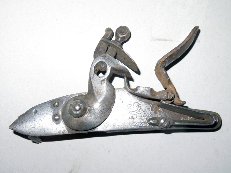 Sie bieten auf ein großes altes originales Steinschloss mit Gravur, verschmottet, mit Gebrauchsspuren im Fundzustand.