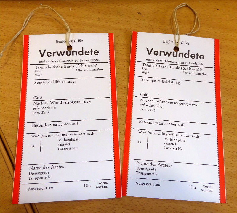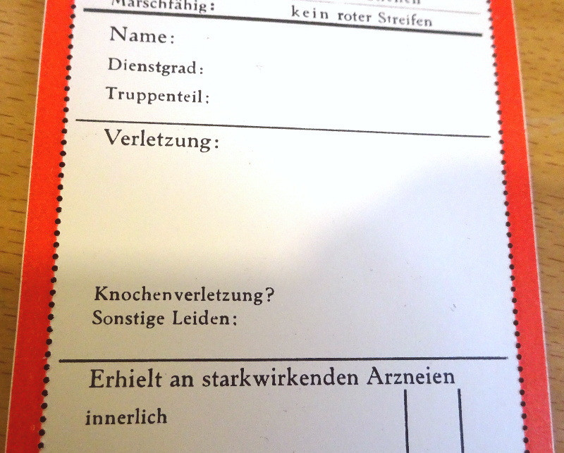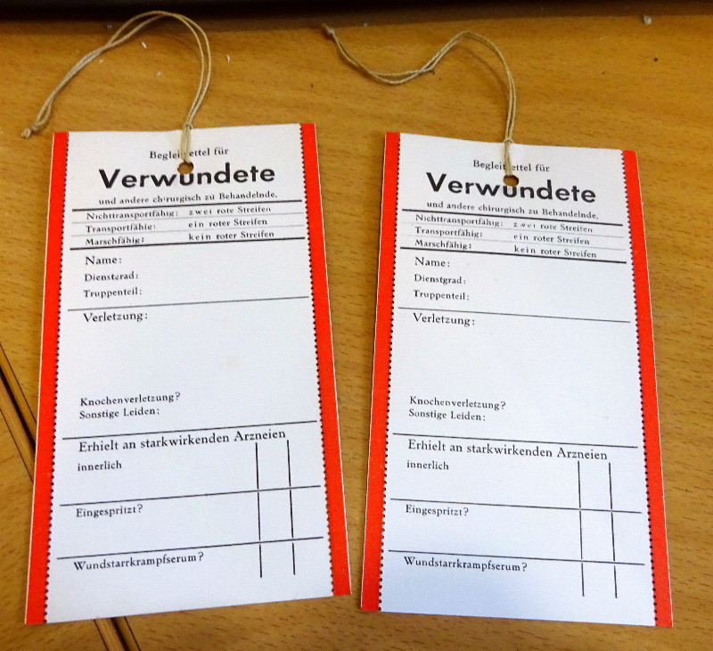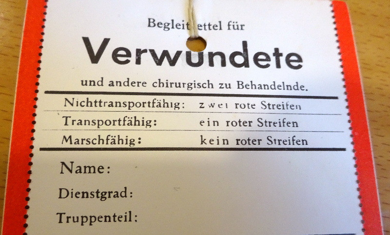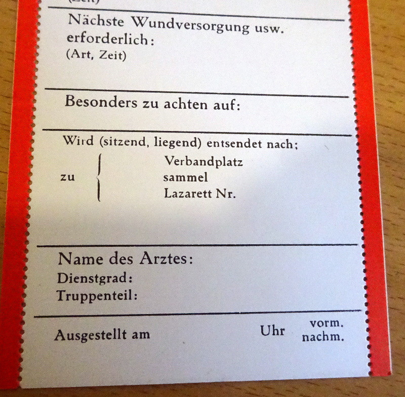 Am Rand des Verwundeten Zettels befinden sich links und rechts noch rote Randstreifen zum Abreißen. wurden beide roten Randstreifen entfernt so bedeutete dies, dass dieser Soldat noch marschfähig war, wurde ein roter Randstreifen entfernt und ein roter Randstreifen verblieb am Zettel dann hatte dies die Bedeutung, dass der Soldat zumindest transportfähig war; Und waren beide roten Randstreifen noch vorhanden so war dieser Soldat nicht einmal transportfähig und somit schwerst verwundet;