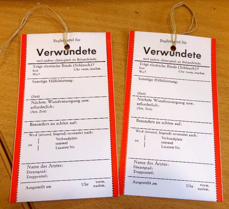 absolut tolle Stücke - speziell in diesem top schönen Erhaltungszustand heutzutage nirgends mehr zu finden. Konkret handelt es sich hier um Verwundetenzettel aus dem WK2 vom Fronteinsatz; Verletzte Soldaten wurden zurück zum ersten Lazarett gebracht; hier begutachtete ein Frontarzt einen verwundeten Soldaten, erledigte eine Erstversorgung, und füllte hierbei diesen Zettel aus. Dieser wurde dann mit einer Schnur an der Uniformjacke des Soldaten befestigt. So konnten Sanitäter und andere Ärzte relativ rasch erkennen wie schwer die Verwundungen sind und was hier bereits in der Erstversorgung durchgeführt wurde.