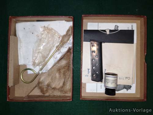 Reinigungswerkzeug und ein Ersatzmagazin ohne Kunststoffmagazinfuß sowie eine Schutzhülle für die Waffe, noch in originaler Kunststoffumverpackung, sind ebenfalls im Angebot enthalten.