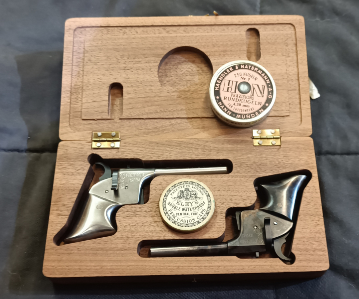 2 Stück Saloon-Pistole in Original Holz Cassette, von der im Original zwischen 1860 und 1863 nur etwa 200 Stück gefertigt wurden. Die Pistole verschießt Bleikugeln nur mit einem Zündhütchen ohne Treibladung: kraftvoll, präzise und relativ leise auf kurze Entfernung. Einfach nur eine Kugel in die Ladevorrichtung, Zündhütchen aufsetzen, schussbereit. Es sind Zündhütchen und ca 200 passende Kugeln dabei.