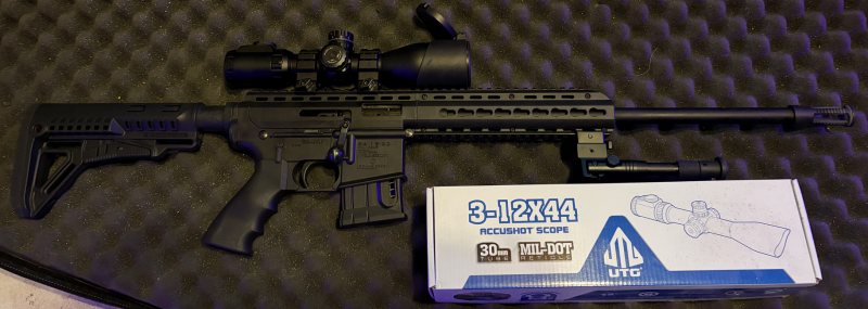 Die Waffe ist ausgestattet mit UTG-Zubehör und einem verstellbaren Schmeisser-Schaft, alles in gepflegtem Zustand.