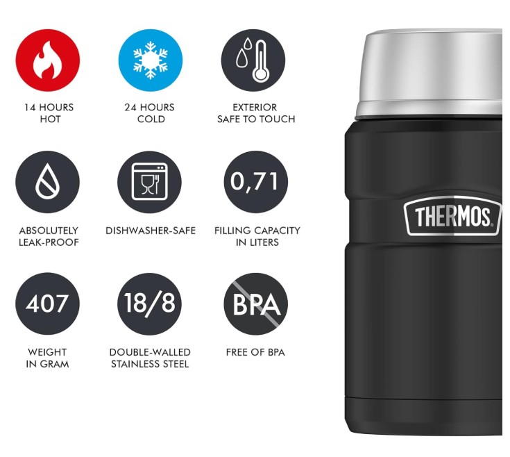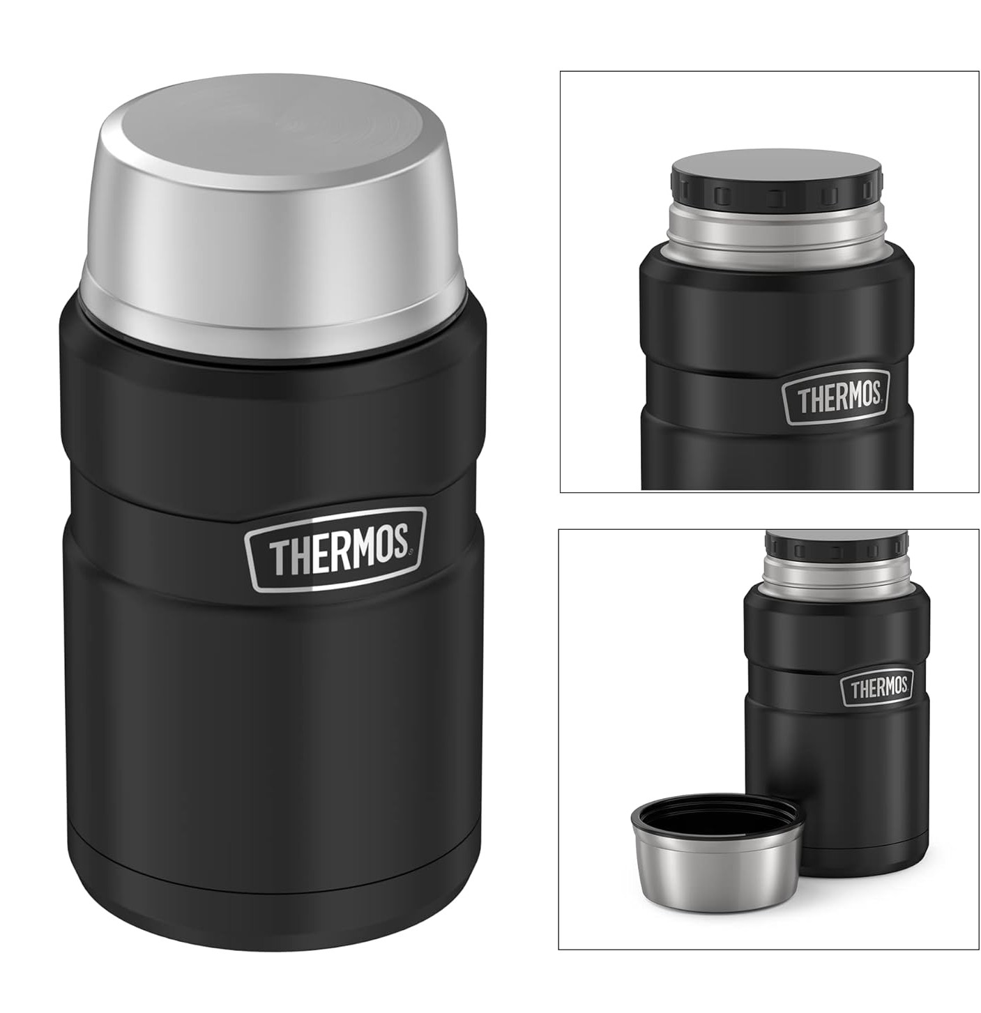Mit dem besonders großen Isolier-Speisegefäß der Serie Stainless King von Thermos genießen Sie unterwegs große Portionen Ihrer selbst gemachten Gerichte.