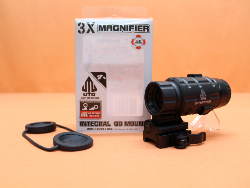 UTG 3x Magnifier FTS QD Mount (SCP-MF3WEQS): Vergrößerungsmodul 3x für Leuchtpunktvisier, stufenlose Höhen-/ Seitenverstellung, Gehäuse aus matt-schwarzem Aluminium. Incl. Flip-To-Side QD Montage für Weaver-/ Picatinnyprofil/ Rubber-Covers.