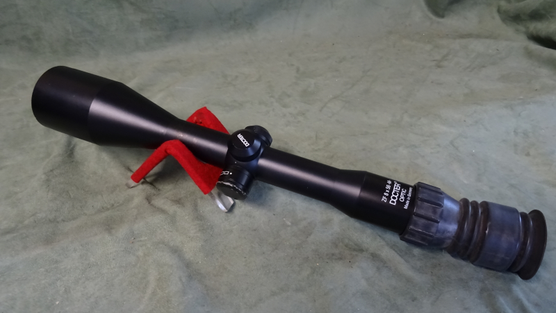 Gebrauchtes Zielfernrohr von Docter Optik, 8x56-M, mit Leuchtabsehen 4, mit Leuchtpunkt. Made in Germany. Aluminiumkörper mit 30 mm Mittelrohrdurchmesser. Länge ca.35,5cm. Linsen sind ohne Kratzer oder Putzschlieren, kein Belag oder Pilze. Mechanik ist gängig. Absehen ist zentriert, mit Höhen und Seitenverstellung. Mit Teleskop-Okularschutz.