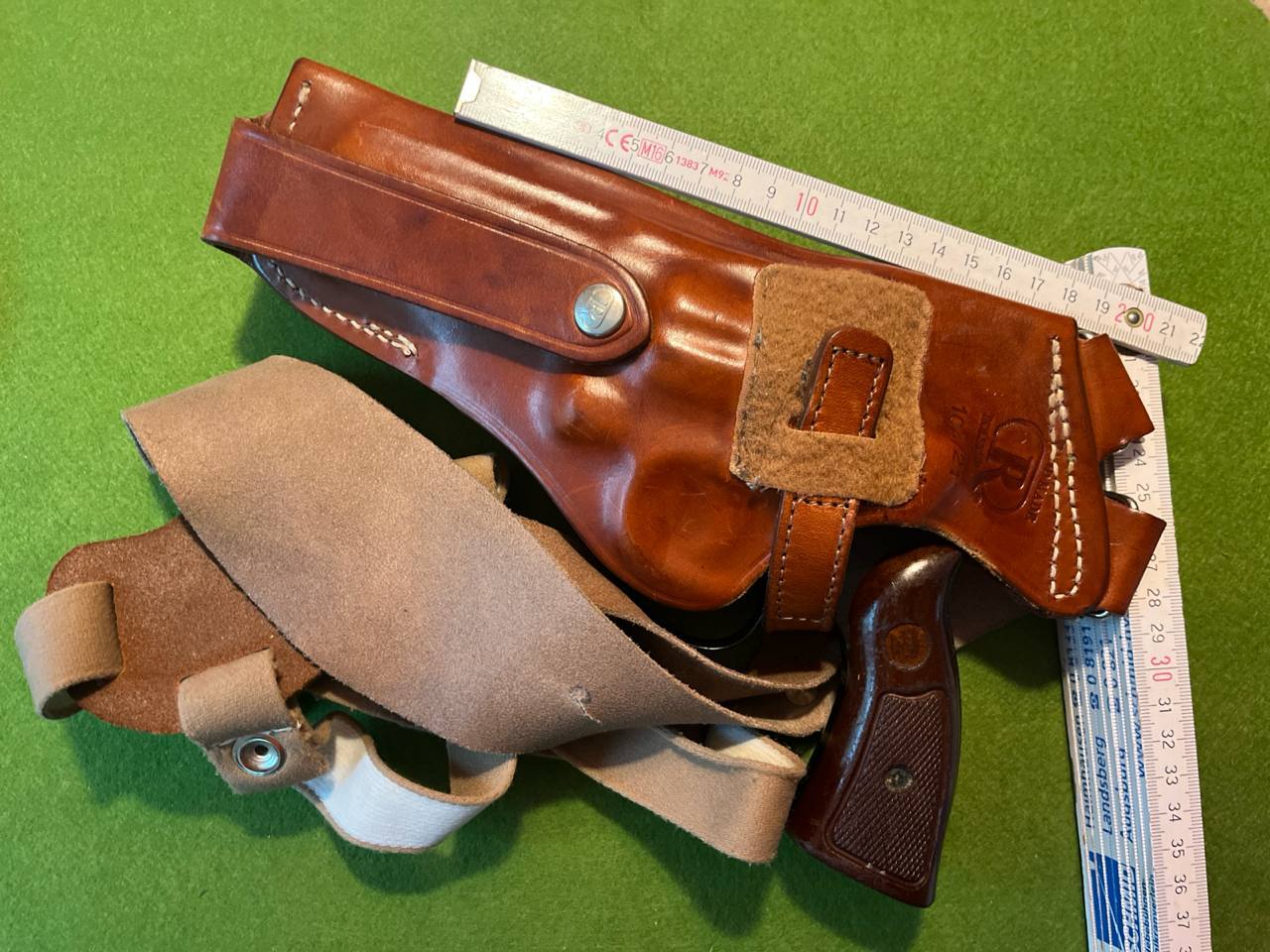 biete ich dieses schönes Schulter- Formholster aus stabilem rotbraunem Leder, offensichtlich für die o.g. Großrevolver und bauähnliche.