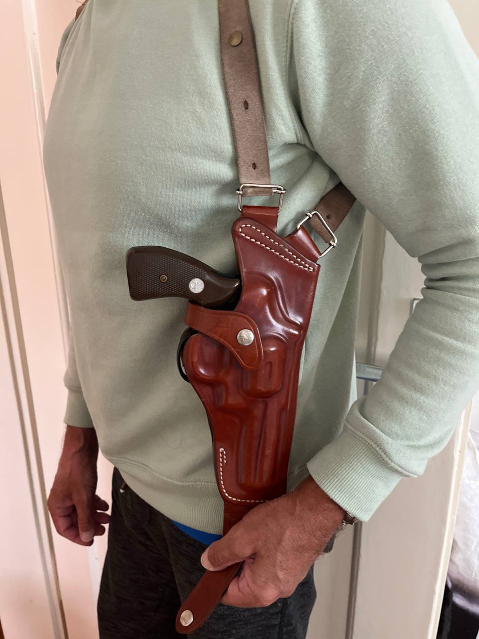 allseitig einstellbares Schulterholster Rechtshand, Träger aus weichem, bequemen Wildleder einstellbar durch hochwertigen Messingsschrauben, mittels Schieber stufenlos einstellbare Schlinge aus Gummiband, Körper aus geformtem Leder geschlossen am Lauf, mit einer mittels Klettverschluss ebenfalls stufenlos einstellbaren Sicherung. Hier die Rückseite