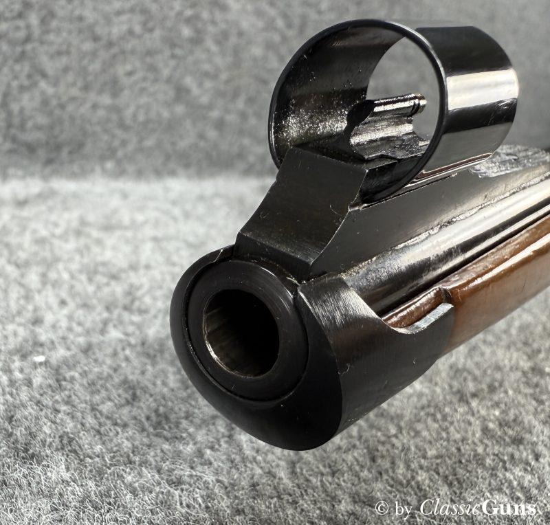 520 mm langer Lauf mit neuwertigem Zug-/ Feldprofil. Sehr gut erhaltene Brünierung. Schöner Nussbaum Vollschaft mit Bayrischer Backe und nur minimalen Gebrauchsspuren. Praxistauglicher und trocken stehender Direktabzug, Mittelschaftmagazin mit Klappdeckel und einer Kapazität von fünf Patronen.
