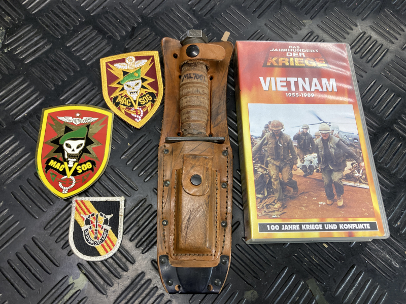 Die VHS über den Vietnamkrieg sowie ein MACV SOG Sticker und ein Patch sowie ein weiteres Patch gehören mit dazu!