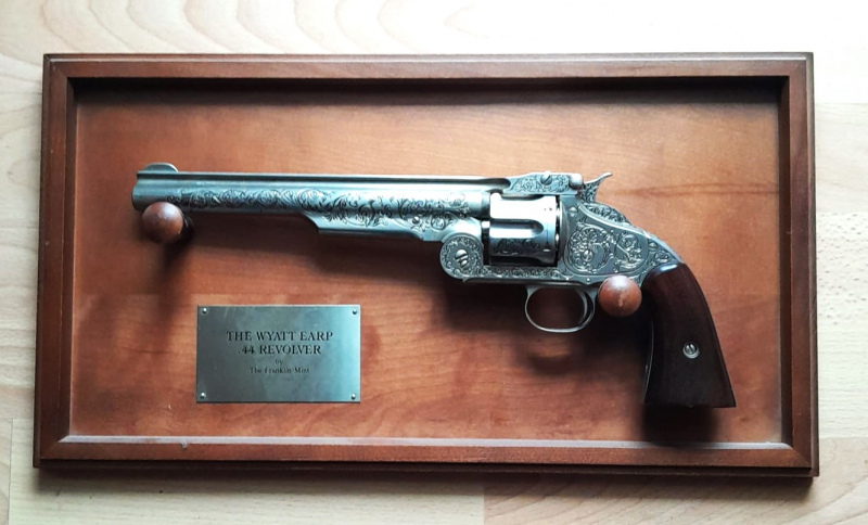 Modellwaffe Wyatt Earp Revolver von Franklin Mint in Neuwertigem Zustand wegen Sammlungsauflösung zu verkaufen.1x Revolver 1x Wandbrett 1x zugehörige Papiere und zusätzlich sechs(6)Hülsen zum Darstellen des Be+Entladens.Funktionen des Revolvers sind einwandfrei.Keine Rücknahme und Garantie