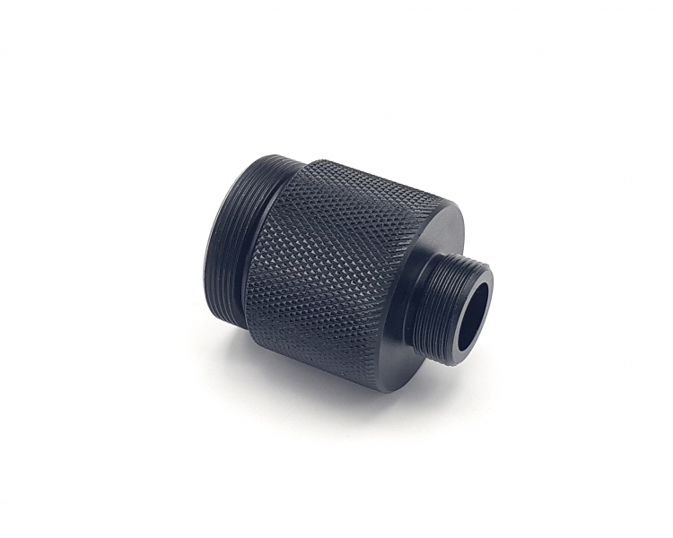 Hochwertige stabile Verarbeitung mit gerändelter griffiger Oberfläche aus schwarz eloxiertem Aluminium. Gewinde 18x1 male auf 30,5x1 male. Zum Verbinden aller gängigen Schalldämpfer mit Anschluss 18x1 wie z.B. Donny FL Emperor, TacJoe und FatJoe mit dem Laufmantel der AEA HP MAX deutsche Version oder der AEA CHALLENGER.