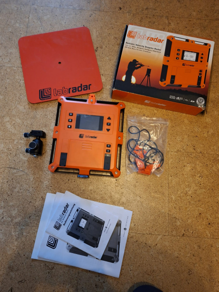 Verkauft wird ein Labradar mit Zubehör, Standplatte und Fuß (LabRadar Bench Mount Plate), sowie Rückstoßsensor mit verschiedenen Adaptern,