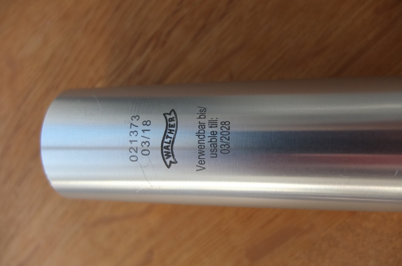 Die Druckluftkartusche hat noch Laufzeit bis 03/2028 kann danach aber gegen eine neue Kartusche getauscht werden. Die Papiere für die Fa.Walther liegen bei.