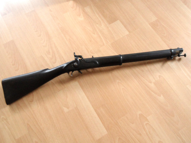 Die Batterie und der Lauf ist aus brüniertem Stahl, die Beschlagteile sind aus Messing. Der braun lackierte Holz Schaft ist handbearbeitet. Kaliber: 15 mm