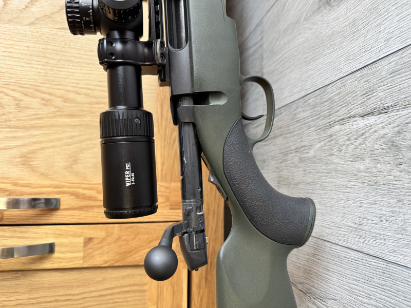 Montiert ist ein Vortex pst Viper in 3-15x 44 auf einer extrem soliden Spuhr Ringmontage. Dieses gehört mit zur Auktion. Die Montage ist auf einer