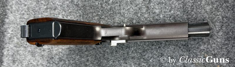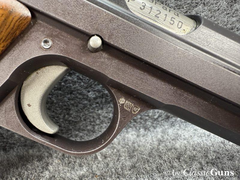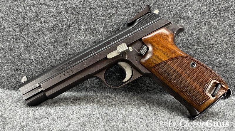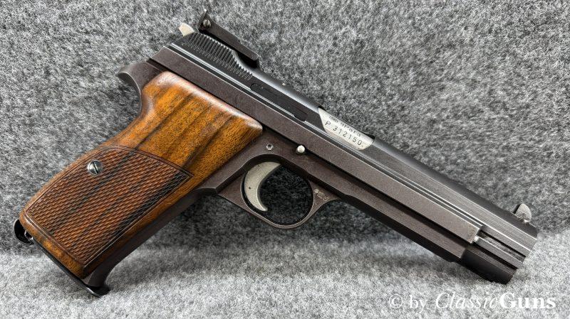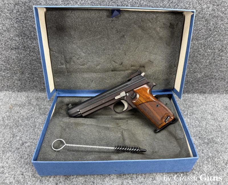Neuwertige und sehr schöne Nussbaumgriffschalen, verstellbare Matchkimme (original SIG) und Lauf mit perfektem Zug-/ Feldprofil. Die Verriegelung arbeitet SIG-typisch sauber und „saugend“, der Abzug bricht traumhaft trocken. Die Schussbelastung scheint minimal zu sein, nennenswerte Gebrauchsspuren sind nicht vorhanden. An der Waffe wurden keine Veränderungen vorgenommen. Die Lieferung erfolgt mit einem Originalmagazin und im Originalkarton.