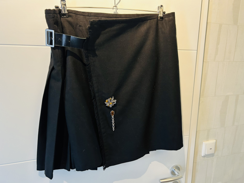 Schöner Kilt in schwarz vorne Glatt hinten mit Falten incl. Brosche u. Nadel mit Tasche siehe Bilder. Der Kilt sieht Klasse aus und sticht durch sein Schwarz hervor. Selten zu finden in dieser Art. Umfang verstellbar von 100-110 cm Länge 55 cm.