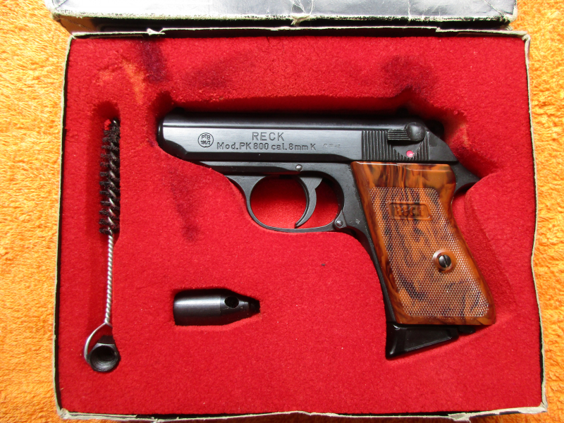 Biete gut erhaltene RECK PK 800 im Kal. 8mm PAK. Die Pistole wird in OVP mit abgebildetem Zubehör geliefert. Die OVP weist altersgemässe Lagerspuren auf. Die Pistole selbst befindet sich in nahezu neuwertigem Zustand. Privatverkauf: Keine Garantie, keine Rücknahme. Nach Geldeingang und Vorlage des Altersnachweises ( ausser ID- Mitglieder), wird die ware umgehend versendet.