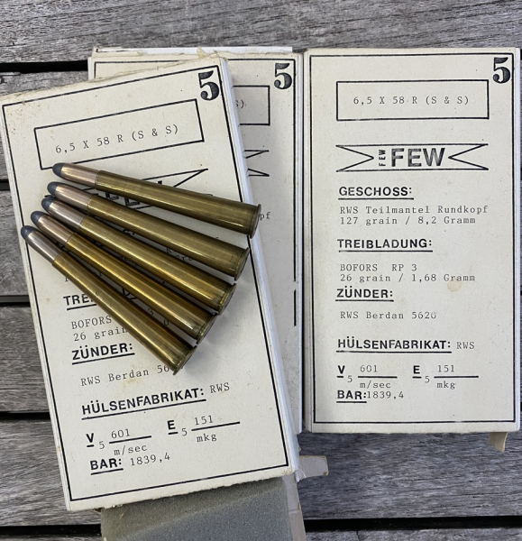 Sie bieten auf 3 Originalpackungen FEW 6,5x58R Patronen (Daten siehe Foto). Die Patronen können gegen Vorlage einer Erwerbsberechtigung vor Ort abgeholt werden.