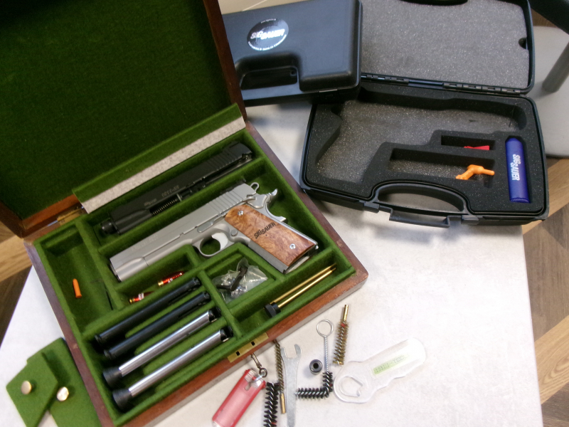 Es ist wie auf den Bildern zu sehen einiges an Zubehör dabei, zu jedem Lauf gehören zwei Magazine, Pufferpatronen für die .45er, Putzstock mit Bürsten und auch die Original Sig Kunststoffkoffer.