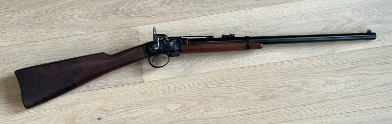 Hinterlader aus Erstbesitz, es wurden nur 20 Schuss abgegeben (anschließend gereinigt und geölt), neuwertiger Zustand, inkl. 20 Ladehülsen (einmal benutzt) und 180 Geschosse - diese können von Hand gesetzt werden, Hülsen fassen 40 grs SP, mit gültigem Beschuss, Länge 99 cm, das Besondere sind die Urethankautschukhülsen welche den Verschluss perfekt abdichten - dadurch bleibt das Patronenlager absolut sauber (besser als bei jeder Sharps) und man kann ohne jede Zwischenreinigung schießen, in OVP