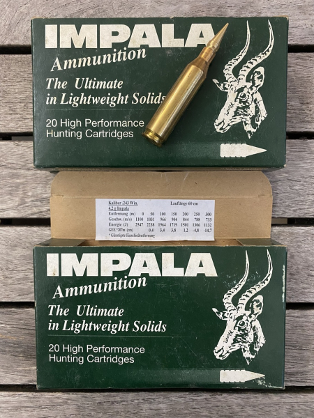 Sie bieten auf 2 Schachteln Originalpatronen(40 Schuss) der Fa. Impala im Kaliber .243 Winchester.