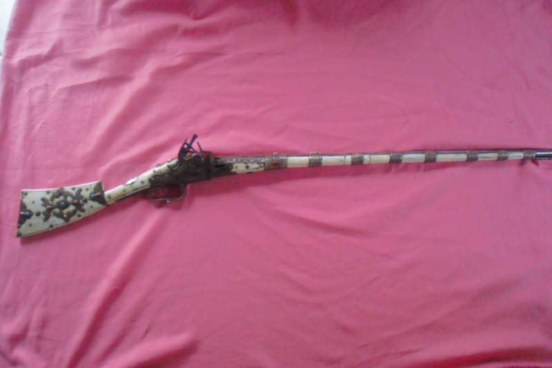 Biete hier ein altes orientalisches Prunkgewehr mit Silbermontierung Korallen und Schmucksteinbelegt. Schloss rastet nicht ein. Ein sehr schönes Stück leider keine Verwendung dafür. 137 cm gesamt (Versand Sperrgut) Weiter Bilder auf Anfrage kein Problem.