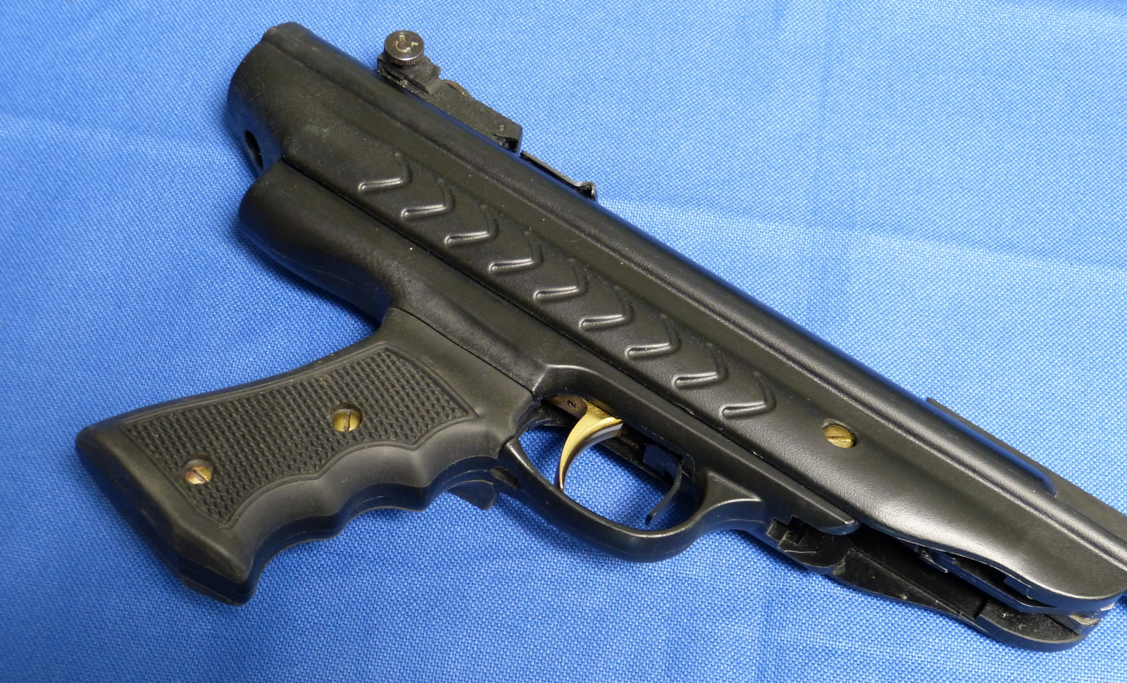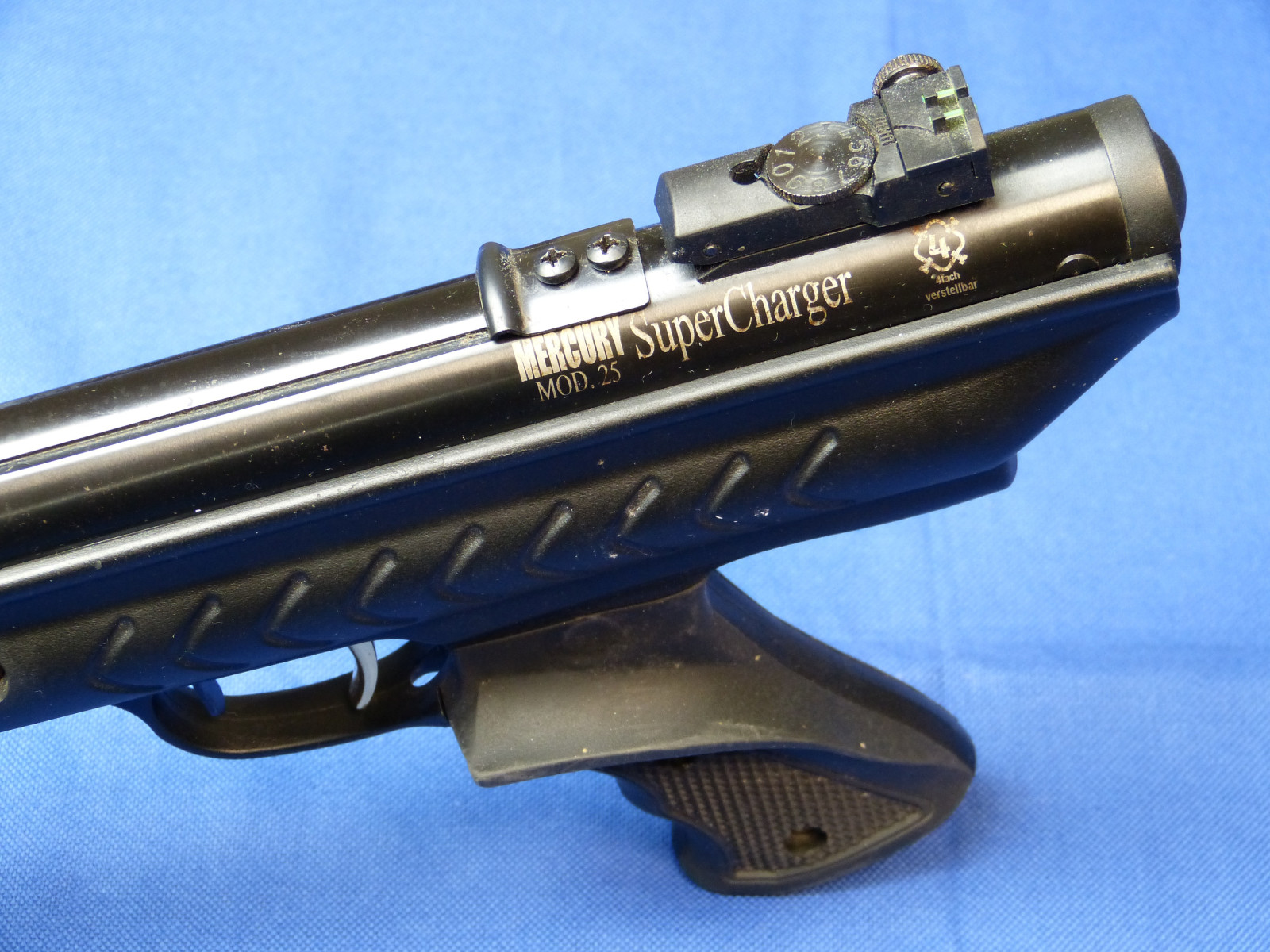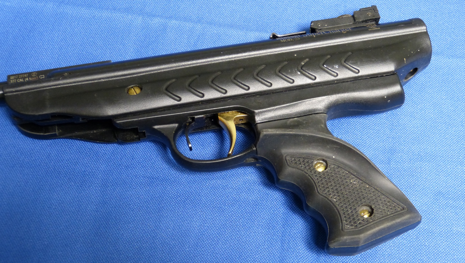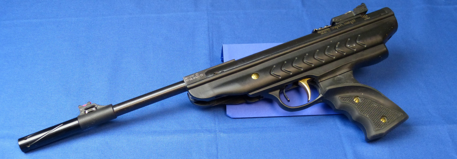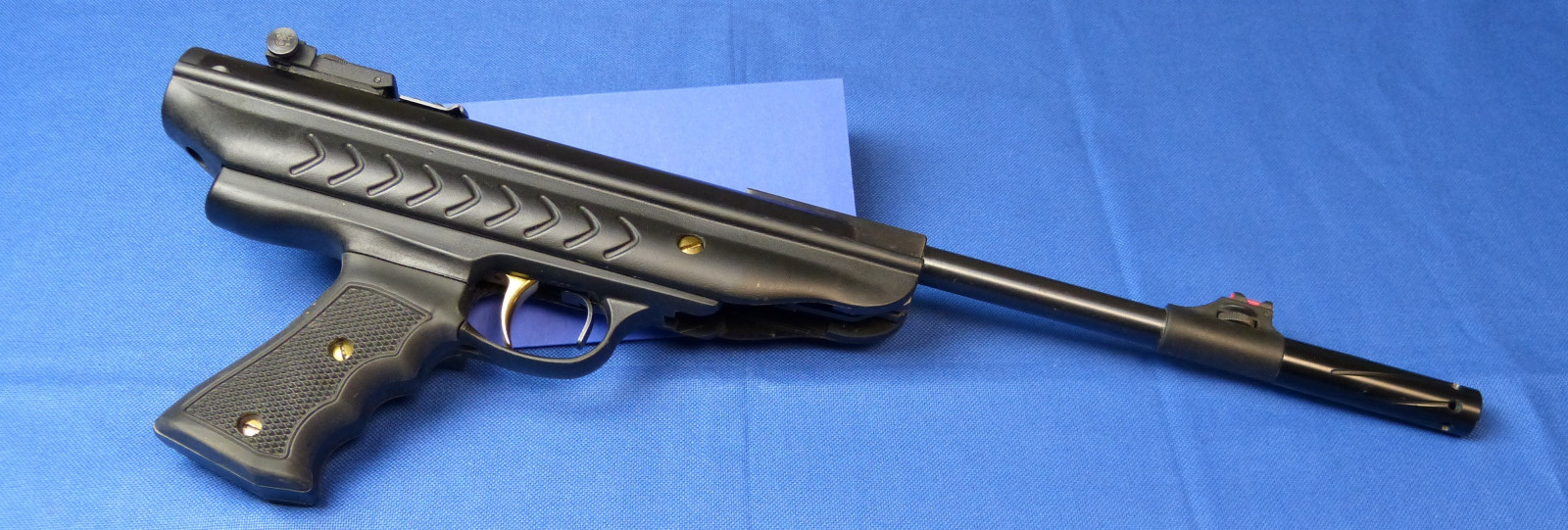 Eine Kipplauf Luftpistole mit einer in dieser Klasse hohen V0 / E0 siehe Messprotokoll unten. Gleichmäßige Mündungsgeschwindigkeit. 11mm Prismenschiene zur Montage eines Zielfernrohrs oder Red Dot.Ein „Bremsschuh“ ist bereits an der Montageschiene integriert.
