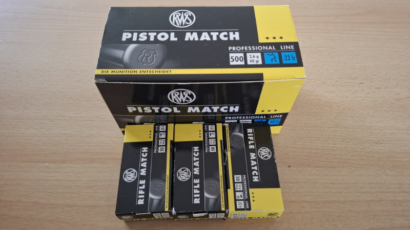 Ich verkaufe 13 Packungen a 50 Schuss (650 Schuss) RWS Pistol/Rifle Match KK Munition. Diese teilt sich wie auf dem Bild zu sehen, in 500 Schuss Pistol Match und in 150 Schuss Rifle Match auf.