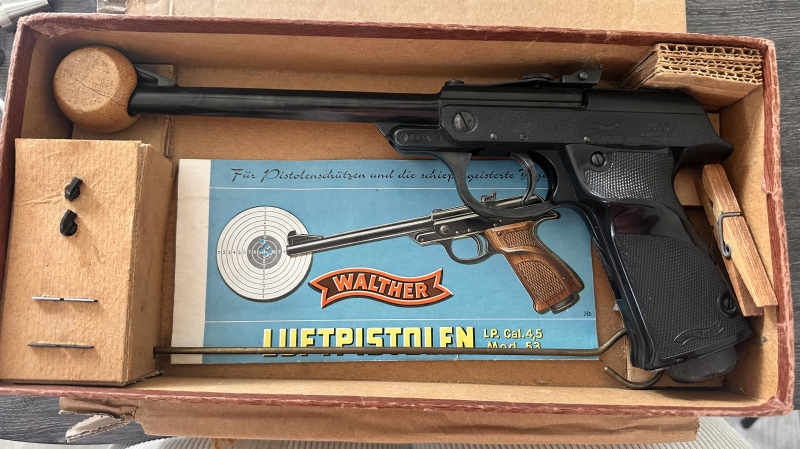Zum Verkauf steht eine vererbte Walther LP Mod. 53 im Kaliber 4,5 mm / .177. Die Pistole stammt aus einem Nachlass und wurde von mir nicht dauerhaft genutzt. Ich habe die Waffe geprüft und getestet — sie funktioniert einwandfrei (Federkolben-Antrieb, Abzug und Spannmechanik laufen sauber).