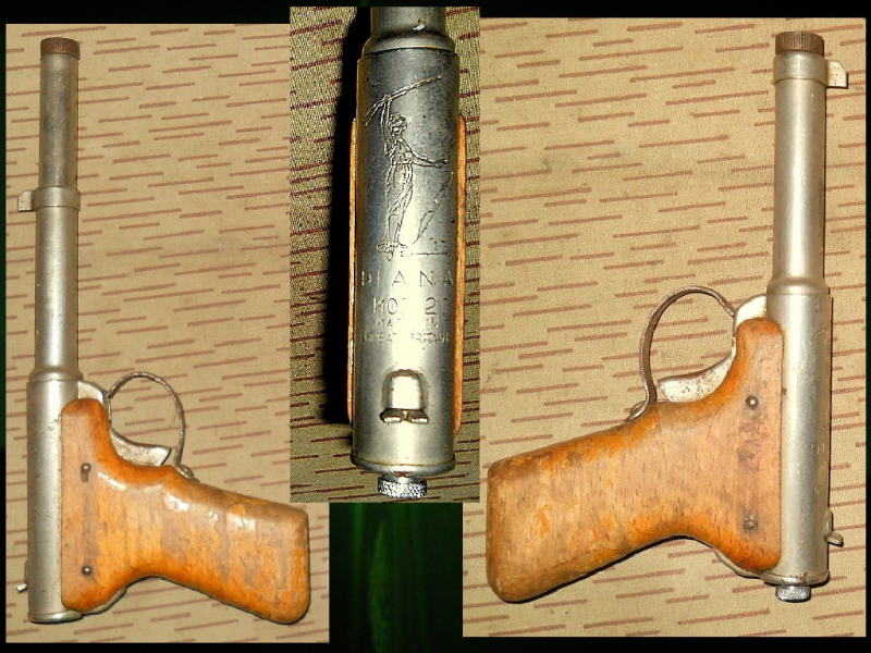 DDachbodenfund … alte Luftpistole ... Kal. 4,5mm-Diabolo … Hersteller DIANA –Mod.2 … wohl frühe Nachkriegs-Produktion – Made in Great Britain … ohne „F im Fünfech“ da in der BRD vor 1970 – also Frei ab 18Jahre … glatter Lauf in gutem-sehrgutem Zustand … lässt sich spannen und abschlagen … augenscheinlich rissfreier Holzgriff … schöne Patina ... tolle, seltene Luftpistole in echt sammelwürdigem Zustand