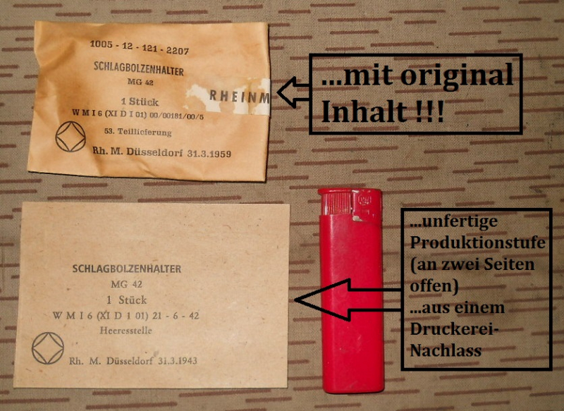 ...Beschreibung: ... 1x Schlagbolzenhalter MG42 in OVP von Rheinmetall 1959 + eine orig. Verpackung von 1943 ... siehe Bild ... --- ... --- ... Bei Versandkosten von 2,95euro (Großbrief/BüWa) bekommen wir KEINE Tracking-Nummer!!! Ein Versand mit Tracking-Nummer (...dann 5,40euro), kann auf Wunsch des Käufers vorgenommen werden. (...bitte kurze Info per Mail) ... --- ... --- ... Dies ist eine Privat-Auktion. Keine Rückgabe, Garantie, Nachverhandlung o. ähnl. --- Versand erfolgt nach Zahlungseingang (und ggf. Altersnachweis), meißt binnen der nächsten 5 Werktage --- Bezahlung ausschließlich per Vorkasse/Überweisung (die Kontodaten erhalten Sie in der egun-Kaufmail) --- PayPal-Zahlung ist NICHT möglich !!! --- Bitte „Allgemeine Hinweise d. Verkäufers“ zum Thema Versand beachten --- Bitte bieten Sie nur, wenn Sie mit diesen Bedingungen einverstanden sind.