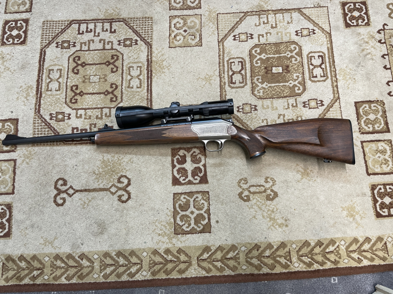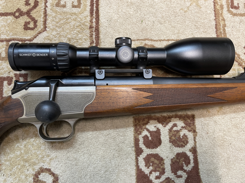 Verkaufe eine Rep.-Büchse Fa. Blaser Modell 93 im Kal. 9,3x62. Die Waffe hat einen Holz-Schaft, mit Backe, Kunststoffkappe und Riemenbügel abnehmbar. Der Lauf ist 58cm lang mit offener Visierung, innen blank. Gesamtlänge ist 102cm, Abzug 37cm und ZF 33cm. Montiert ist mit einer Original Blaser Sattelmontage ein Schmidt & Bender Zenith 2,5-10x56 mit Leuchtpunkt 11Stufen und Klarsichtschutzkappe. Brünierung und Schaft sind gut. Verkauft wird nur gegen Vorlage einer gültigen Erwerbsberechtigung (EWB) und Vorlage der NWR- ID-Nr.: P + E!