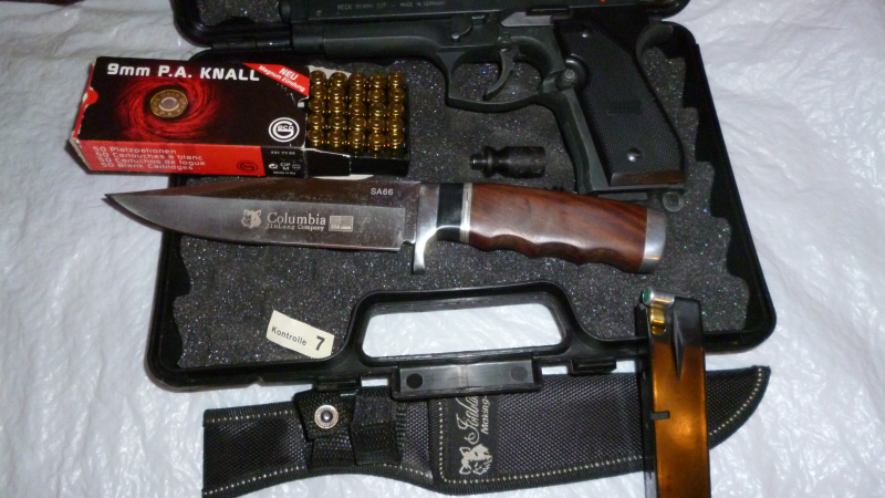 RECK MIAMI 92F, 9mm., mit frische Pfefferpatronen in Magazin+P.A.K. Patronen,mit neu Jagdmesser,