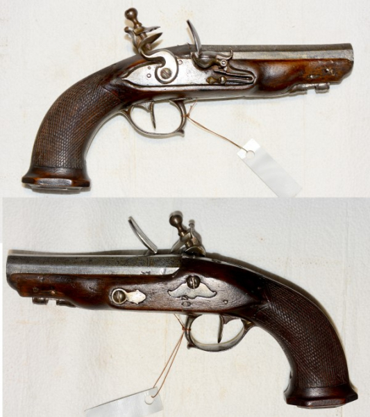 Steinschloss-Reisepistole, Marke "M" mit Krone, um 1800, Lauflänge 15 cm, Gesamtlänge 22 cm, Kaliber 13mm, der Ladestock fehlt, Gebrauchsspuren, technisch völlig in Ordnung