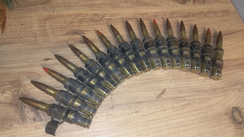 Zum Verkauf steht ein Gurt mit 16 Deko Patronen im Kaliber 12,7x99. Die 4 mit der roten Spitze deuten Leuchtspur Patronen an, sind allerdings nachlackiert. Insgesamt macht so ein Gurt ziemlich was her in der Vitrine 😉 Top für Sammler!