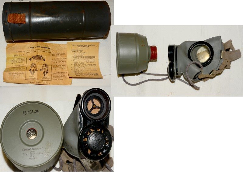 Tschechische Gasmaske Fatra 1939, komplett mit Filter und Büchse. Dieses Modell wurde im 2. Weltkrieg auch an Frankreich geliefert, woher auch das angebotene Stück stammt, zusammen mit französischsprachiger Anleitung. Auch Deutschland setzte dieses Modell als Beuteausrüstung und für den Luftschutz ein.